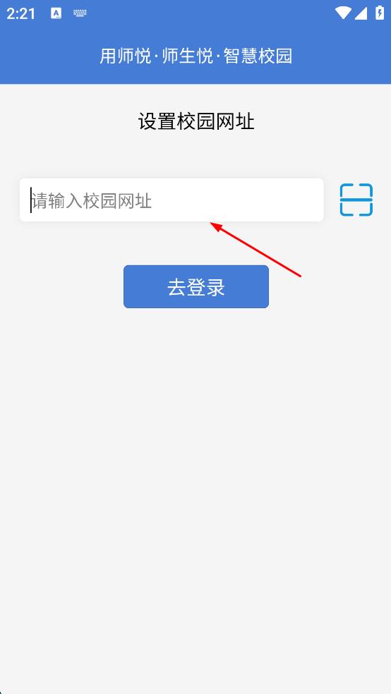 2、在設(shè)置校園網(wǎng)址頁面,點(diǎn)擊輸入框,可選擇手動(dòng)輸入校園網(wǎng)址,也可點(diǎn)擊右側(cè)掃碼圖標(biāo),進(jìn)入掃碼頁面掃碼獲取校園網(wǎng)址。