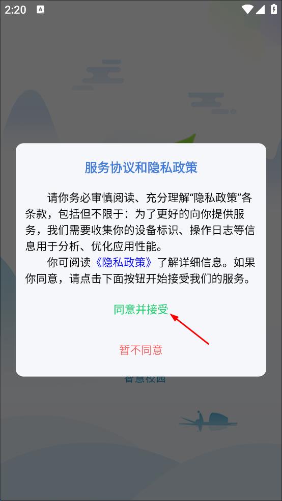 1、打開師悅智慧校園APP,會(huì)彈出服務(wù)協(xié)議和隱私政策頁面,仔細(xì)查看內(nèi)容后,點(diǎn)擊“同意并接受”按鈕,進(jìn)入設(shè)置校園網(wǎng)址頁面。