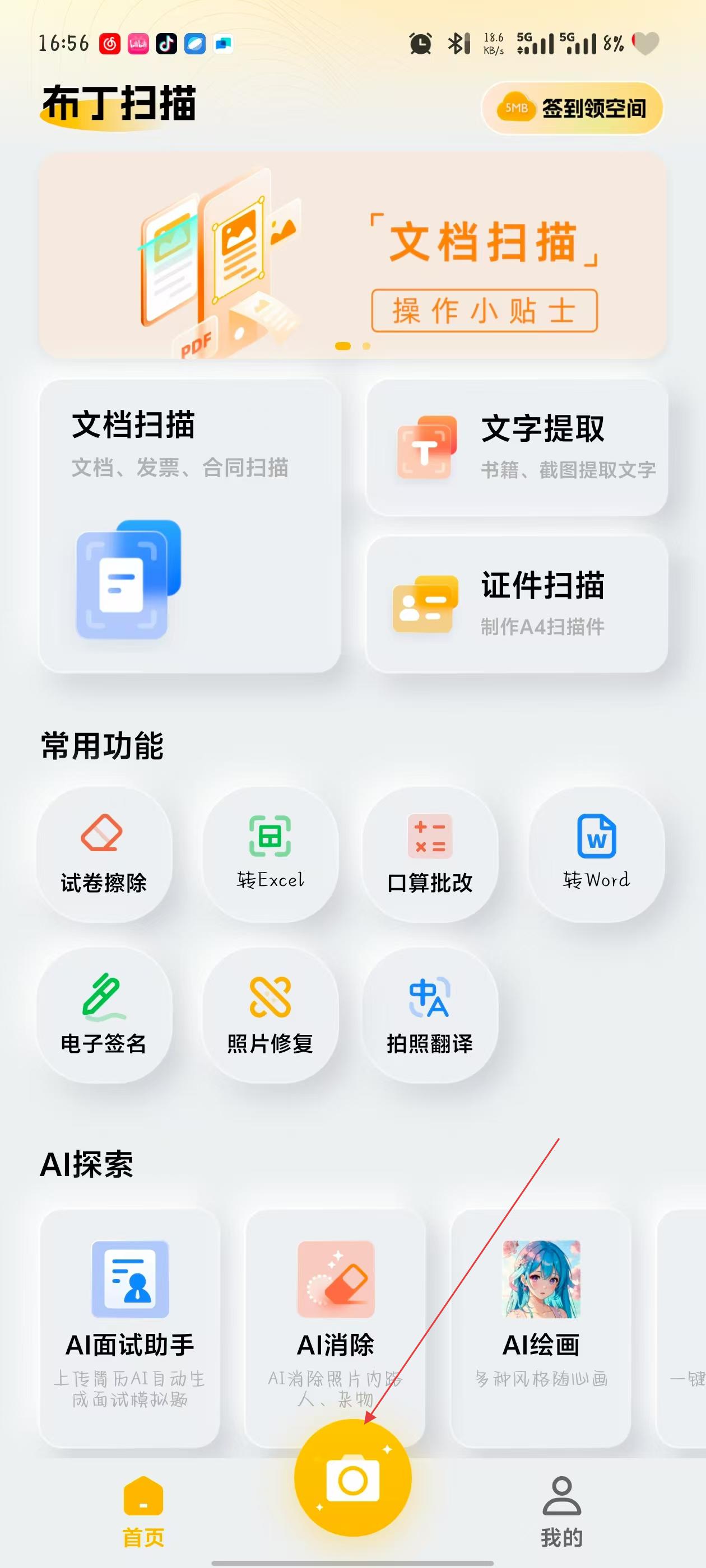 1、打開(kāi)布丁掃描應(yīng)用,在首頁(yè)點(diǎn)擊下方黃色拍照?qǐng)D標(biāo)。