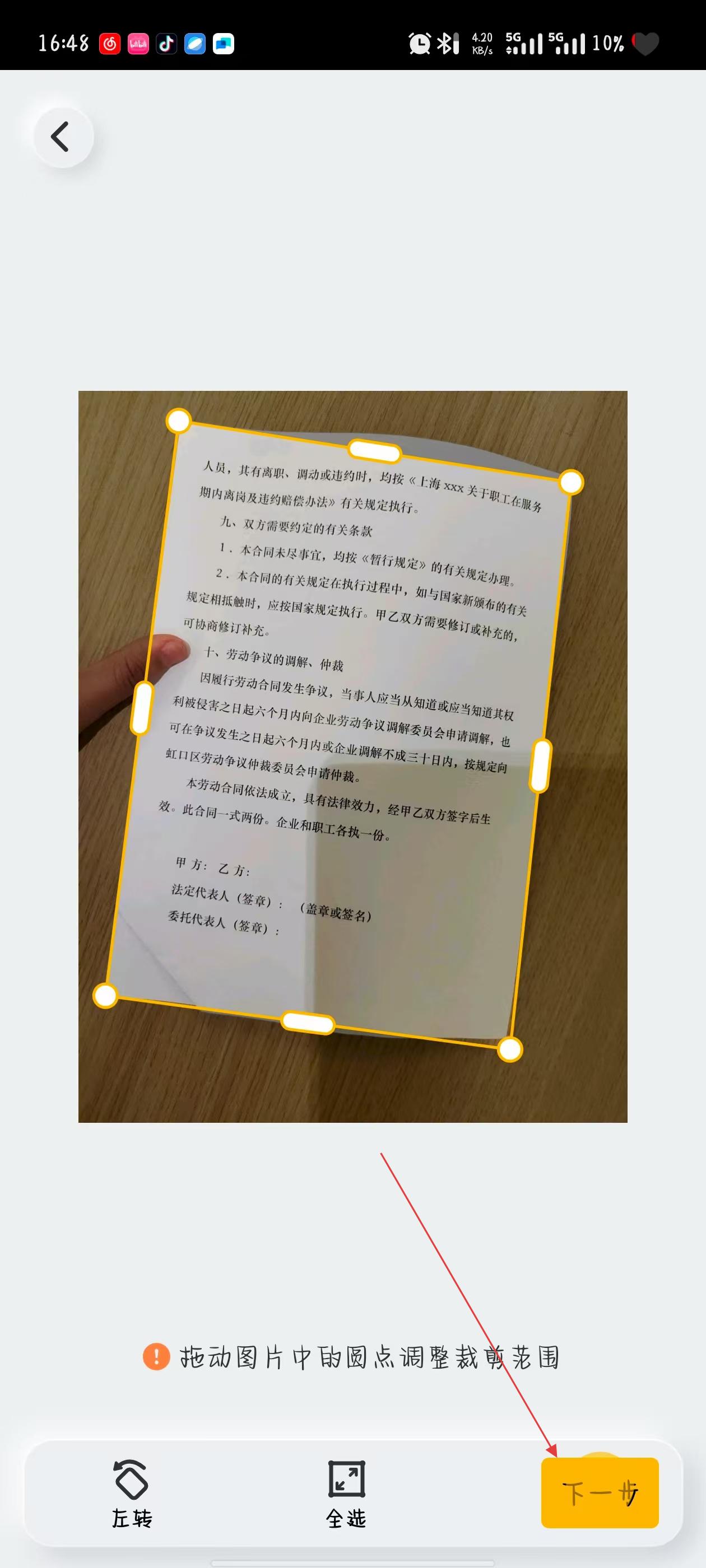 3、點(diǎn)擊拍攝按鈕完成拍攝后,在裁剪界面拖動(dòng)邊緣的調(diào)整點(diǎn),把文檔區(qū)域精準(zhǔn)框選出來(lái),然后點(diǎn)擊下一步。