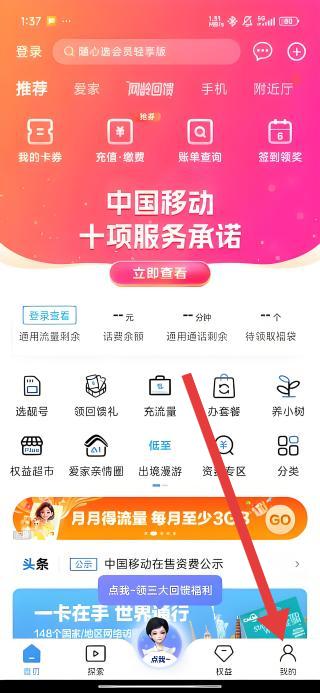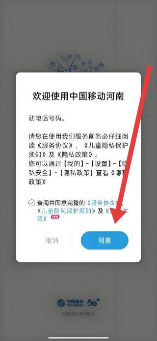 1、打開中國移動河南APP,在服務協(xié)議彈窗勾選同意后,點擊同意按鈕,進入應用主界面。