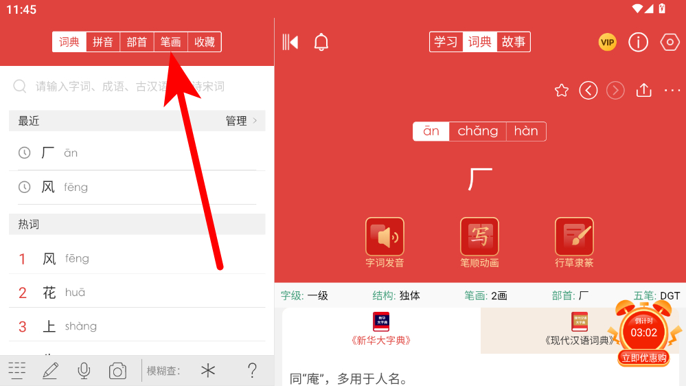 1、在新華大字典界面,點擊上方筆畫選項,進入筆畫檢索頁面。