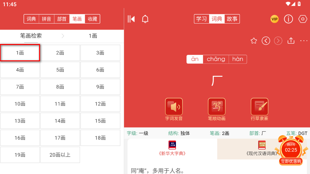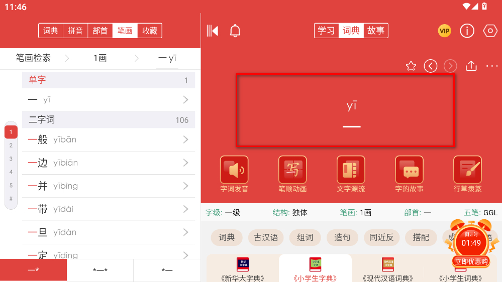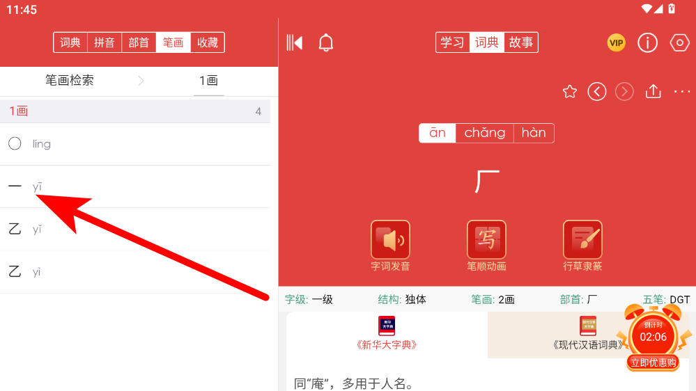 4、點擊后,即可查看該字的詳細(xì)信息,如發(fā)音、筆順等。