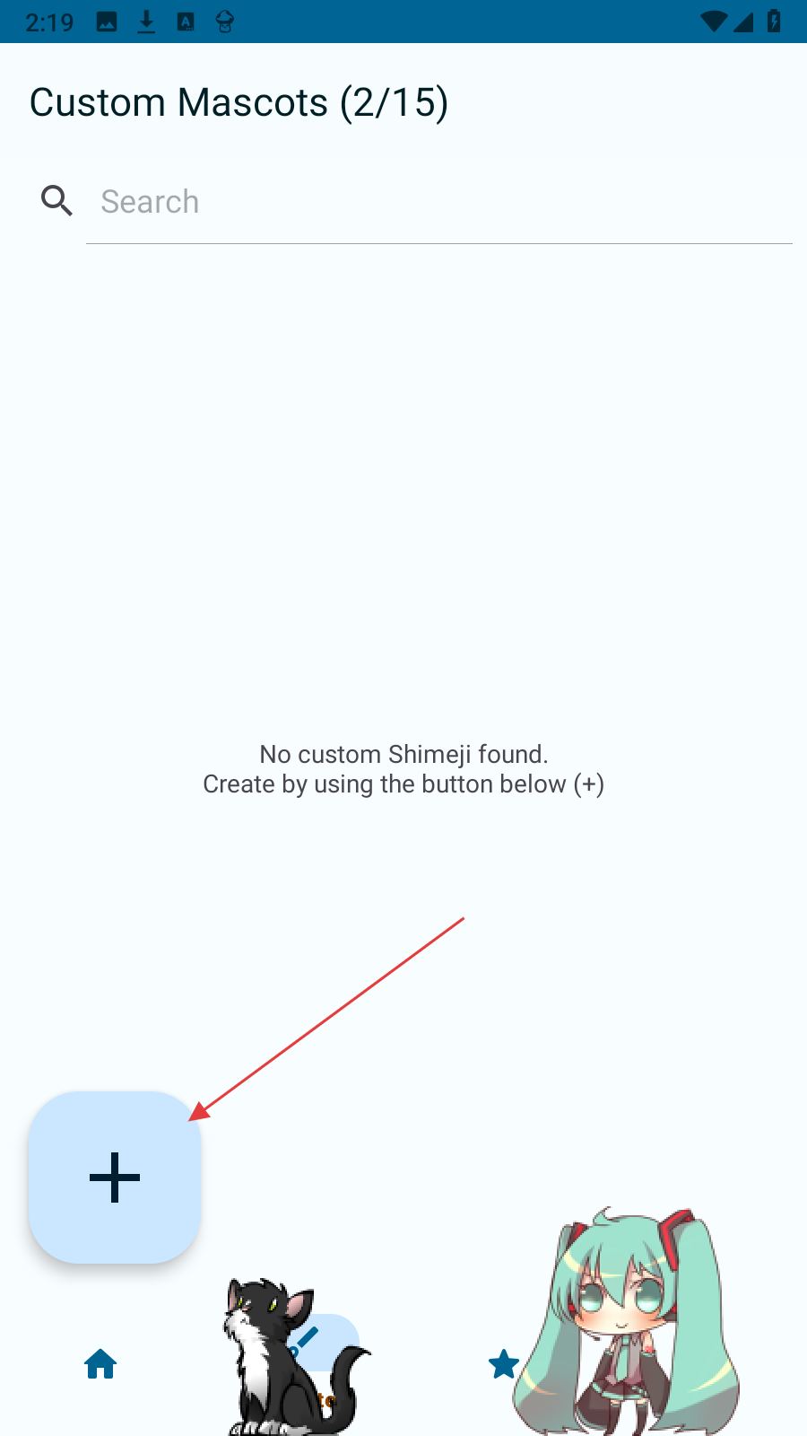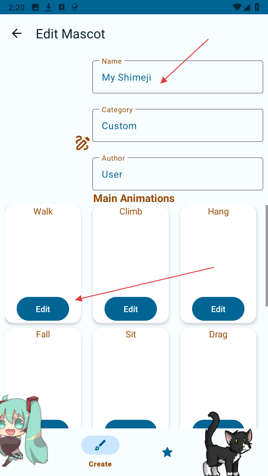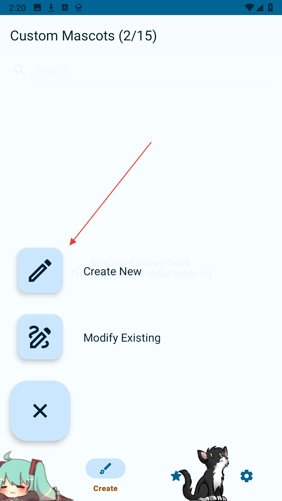 1、打開Shimeji應(yīng)用進入Custom Mascots界面,點擊左下角帶+號的按鈕,彈出選項后選擇Create New,進入桌寵編輯頁面。