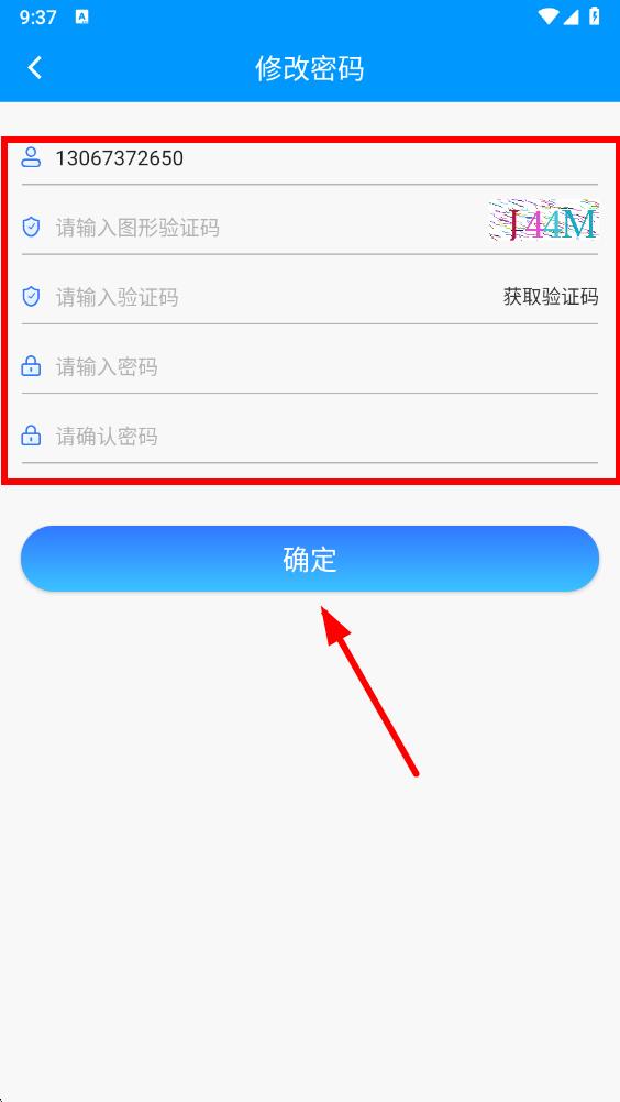 5、在修改密碼頁面,按要求輸入圖形驗證碼、獲取并輸入驗證碼,設(shè)置新密碼并確認密碼,最后點擊確定即可完成密碼修改。