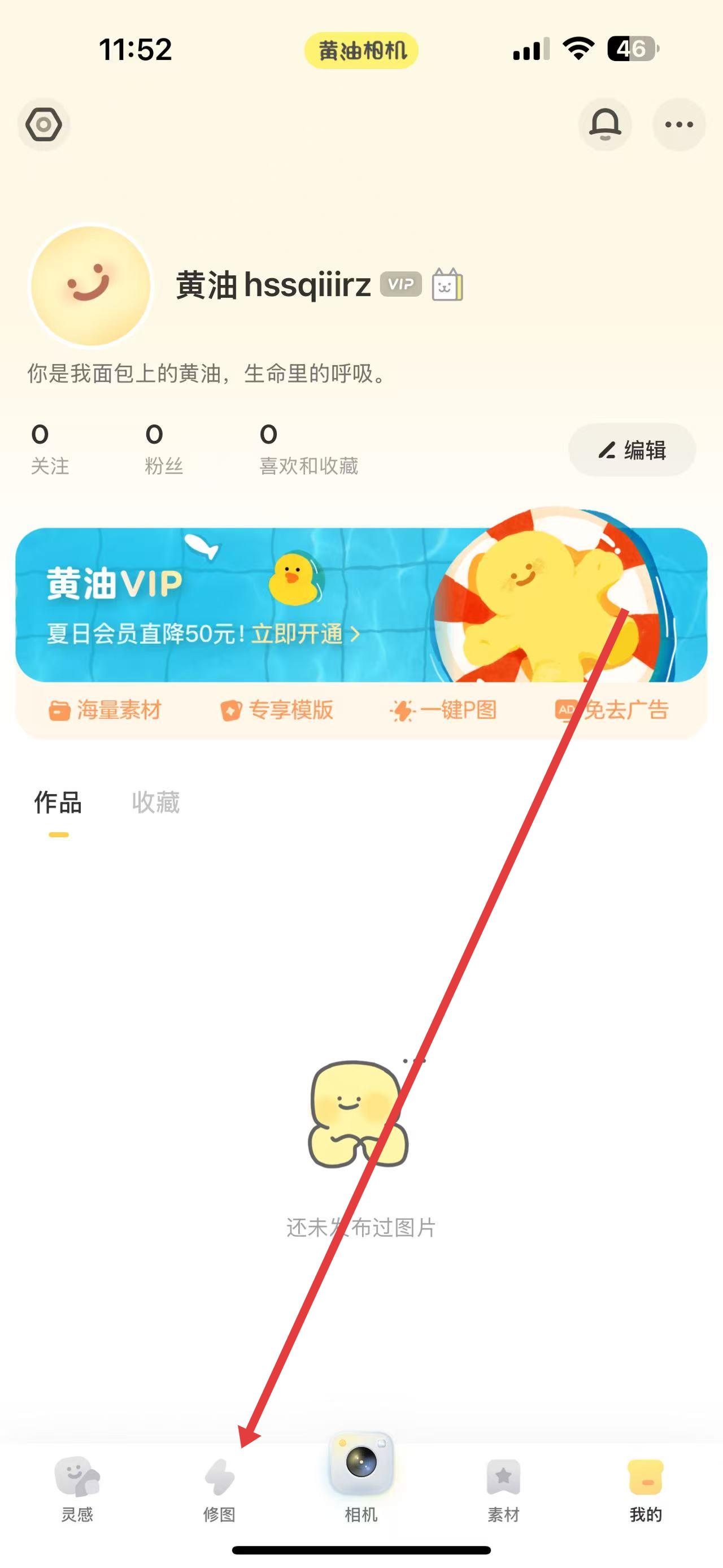 1、打開黃油相機(jī),點(diǎn)擊底部導(dǎo)航欄中的修圖選項(xiàng)進(jìn)入修圖界面。