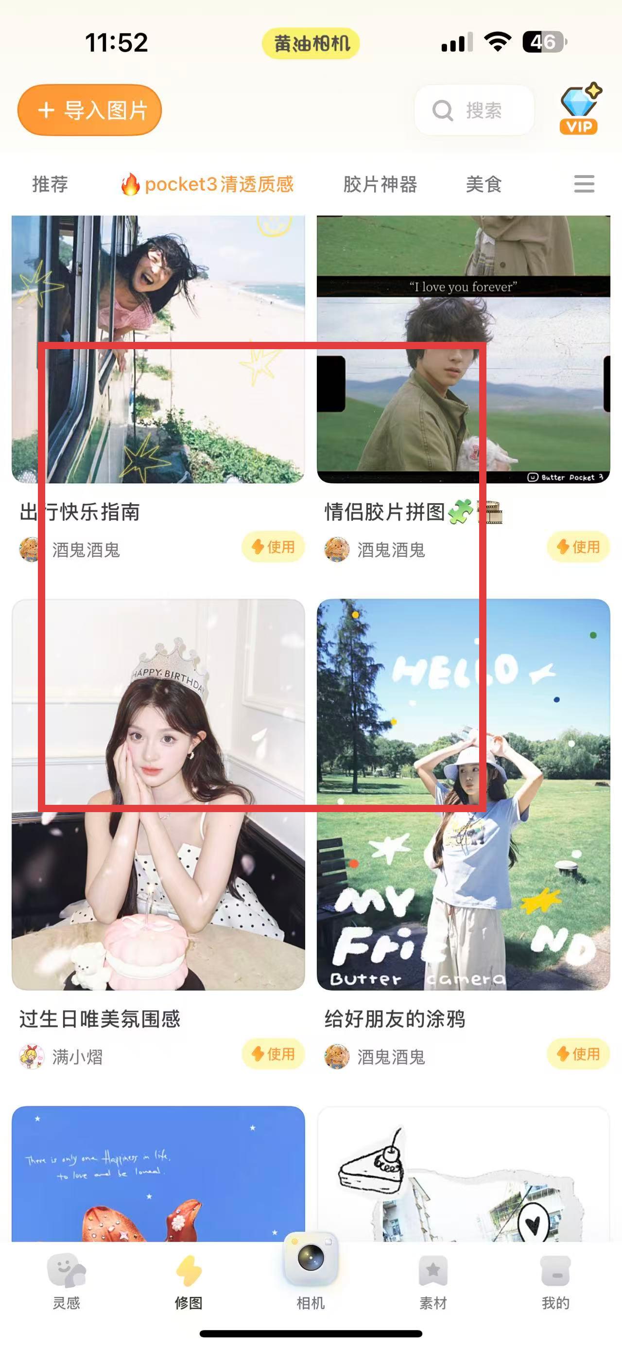 2、在修圖界面中,點(diǎn)擊導(dǎo)入圖片上傳需要p的照片,或者從推薦的模板中選擇喜歡的模板,如出行快樂指南、情侶膠片拼圖等。