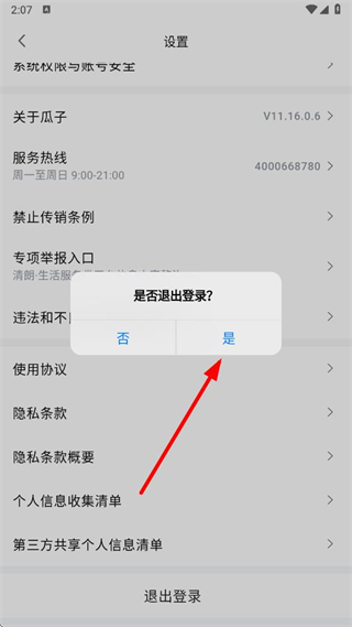 4、在確認(rèn)彈窗中,選擇是選項,即可完成賬號退出登錄操作。