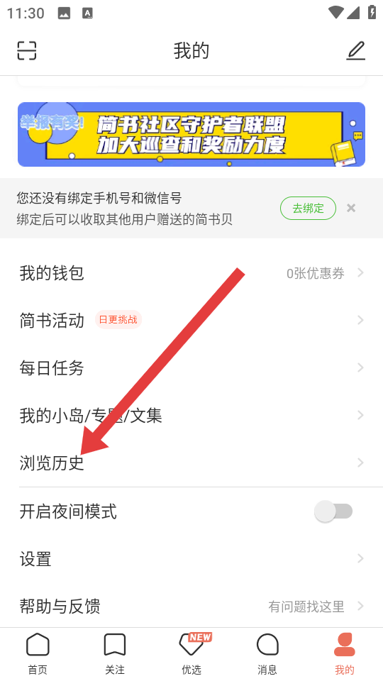 1、在簡書我的頁面,點擊瀏覽歷史的選項,進入瀏覽歷史界面。