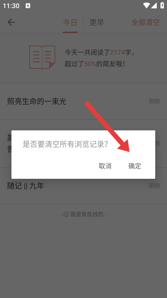 3、在是否要清空所有瀏覽記錄的確認彈窗中,點擊確定按鈕,確認清空。