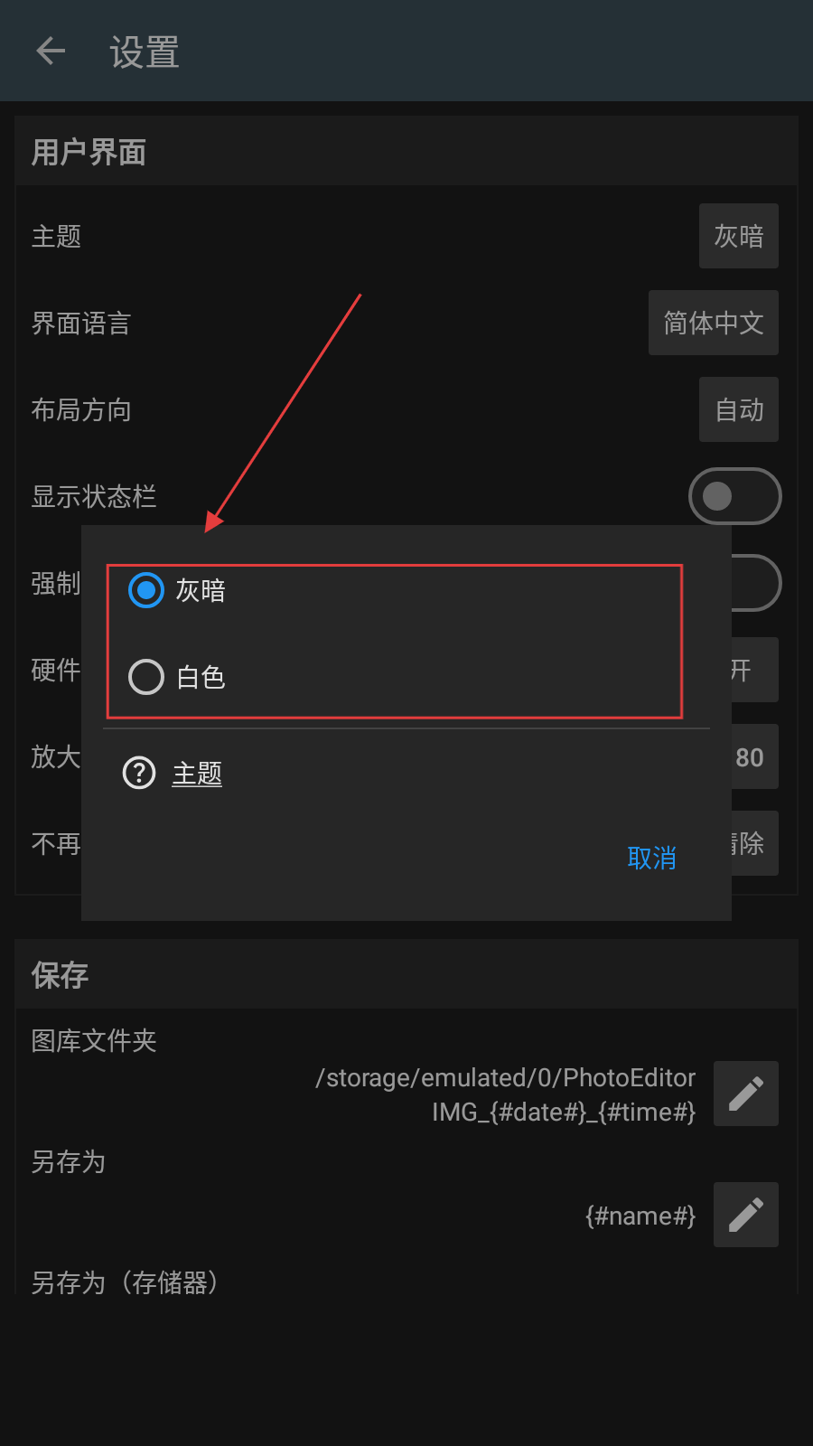 4、在主題選擇窗口中,根據(jù)需求選擇灰暗或白色主題,即可完成主題顏色的更改。