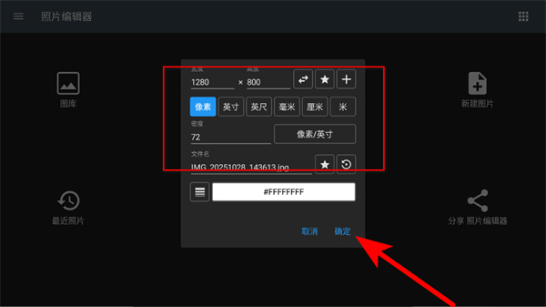 2、在彈出的設(shè)置窗口中,設(shè)置圖片的寬度、高度等參數(shù)后,點(diǎn)擊確定按鈕,創(chuàng)建新圖片。