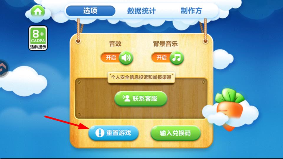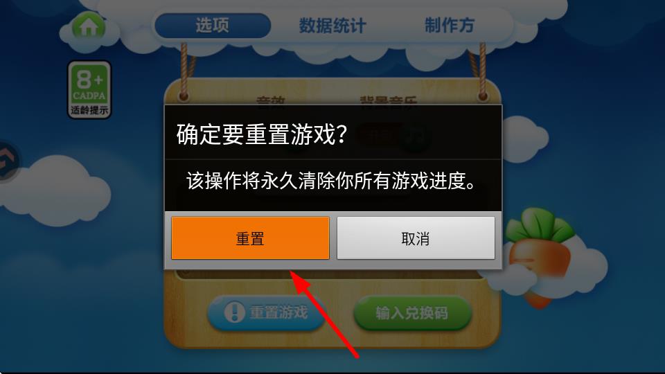2、進(jìn)入設(shè)置界面后在選項(xiàng)欄下可以看到重置游戲按鈕-點(diǎn)擊此按鈕。要留意該操作不可逆-將清除游戲進(jìn)度。