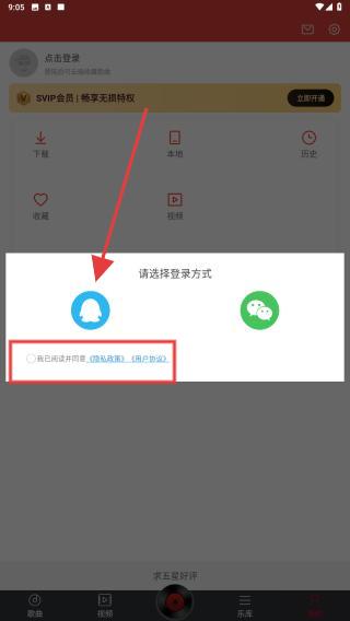 3、點(diǎn)擊后彈出登錄方式,選擇QQ登錄并勾選隱私政策與用戶協(xié)議。