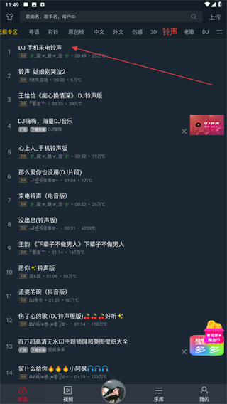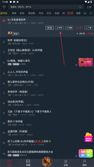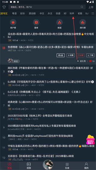1、打開DJ多多APP,進(jìn)入時(shí)點(diǎn)擊上方鈴聲的標(biāo)簽。