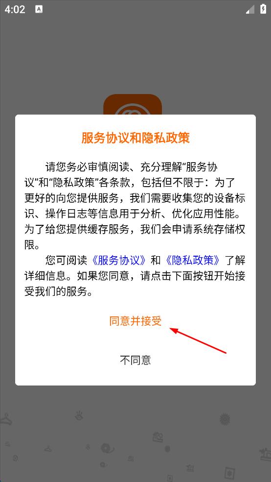 1、打開(kāi)棉花果APP,出現(xiàn)服務(wù)協(xié)議和隱私政策界面,仔細(xì)閱讀后點(diǎn)擊“同意并接受”,進(jìn)入登錄選擇頁(yè)面。