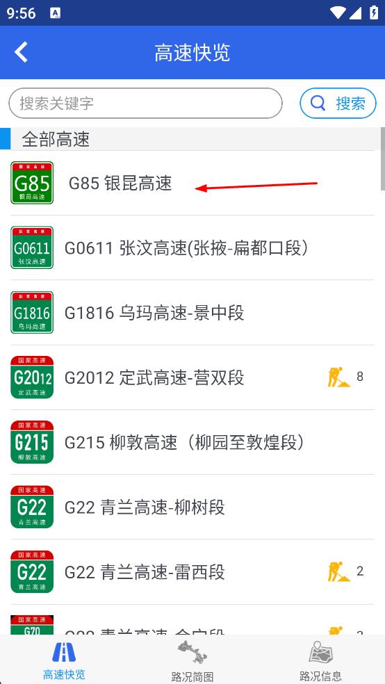 3、在高速快覽界面,找到并點擊“G85銀昆高速”選項,進(jìn)入銀昆高速詳情頁面。