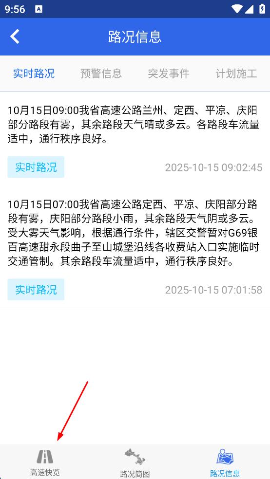 2、在“路況信息”頁面,點擊左下角的“高速快覽”選項,進(jìn)入高速快覽界面。