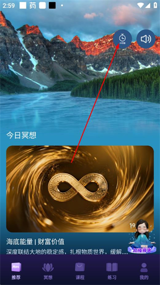 1、在墨爾冥想app的推薦頁面,點擊右上角的計時器圖標,進入計時器設(shè)置頁面。