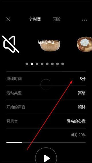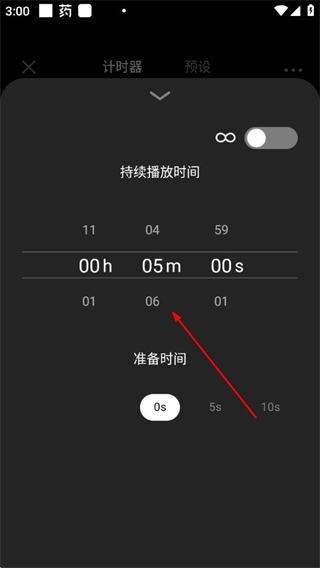 3、在持續(xù)播放時間界面,調(diào)整小時、分鐘、秒數(shù),完成冥想播放時間的設(shè)置。
