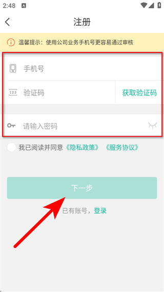 2、在注冊(cè)信息填寫(xiě)頁(yè)面,輸入手機(jī)號(hào)等,勾選協(xié)議后點(diǎn)擊下一步。