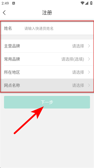 3、填寫(xiě)快遞員姓名、主營(yíng)品牌、所在地區(qū)等信息后,點(diǎn)擊下一步。