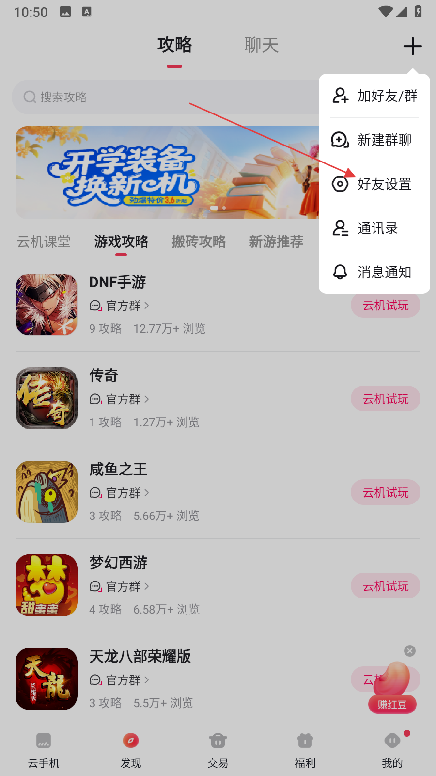 2、在彈出的選項中找到好友設置并點擊,進入好友設置界面。