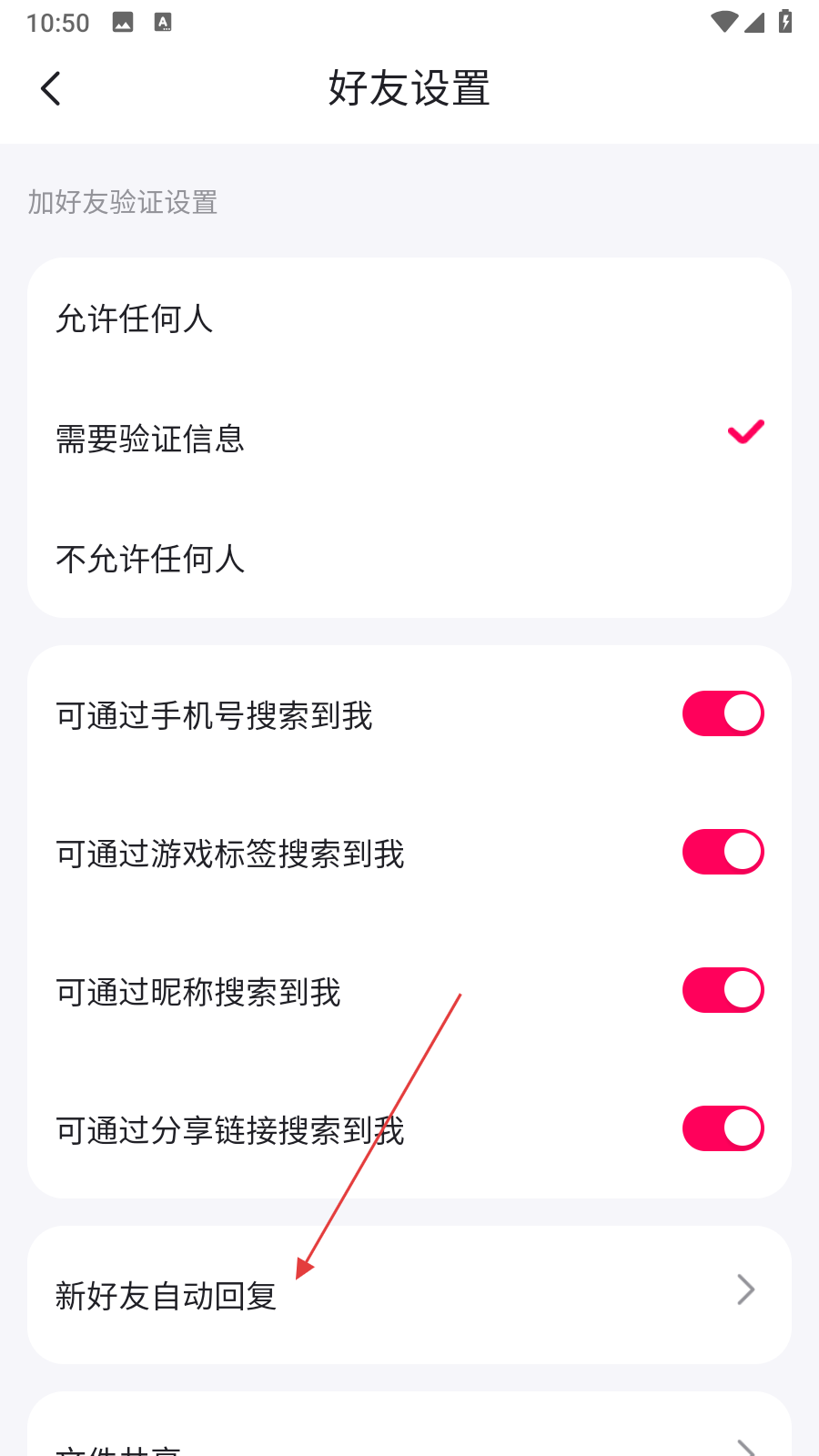 3、在好友設置界面中,找到新好友自動回復選項并點擊,進入新好友自動回復設置頁面。