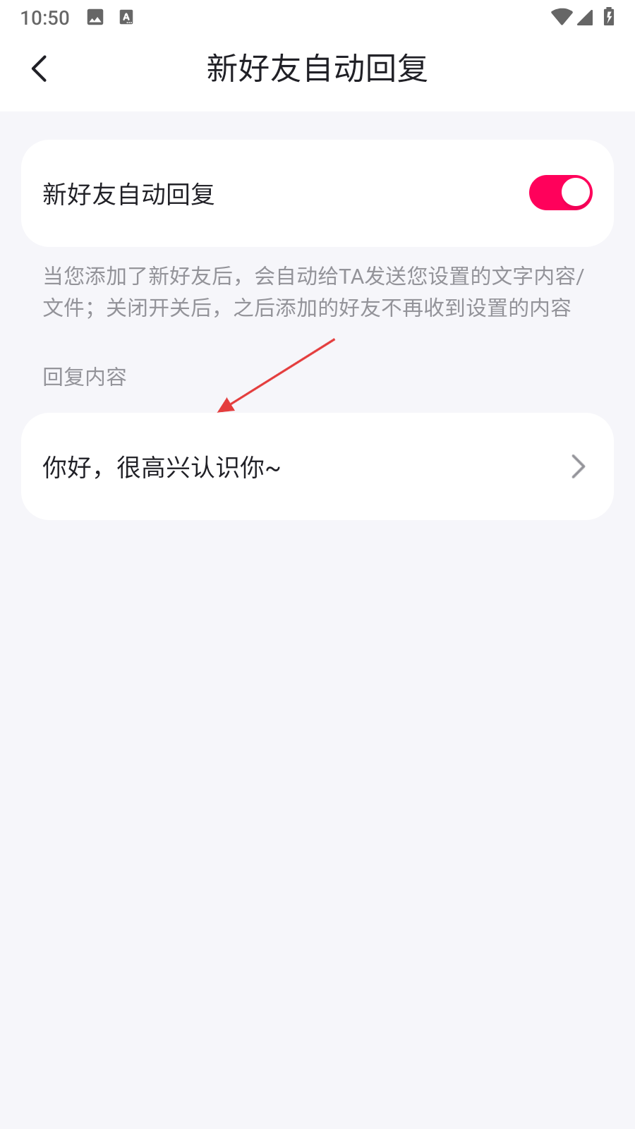 4、在新好友自動回復設置頁面中,找到新好友自動回復開關并點擊開啟,然后點擊回復內容輸入框。