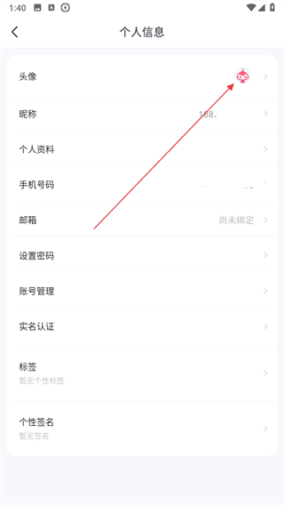2、在個人頁面中,點擊頭像區(qū)域,跳轉至個人信息界面。