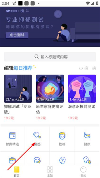 1、打開口袋心理測(cè)試APP,在首頁(yè)點(diǎn)擊情感分類。