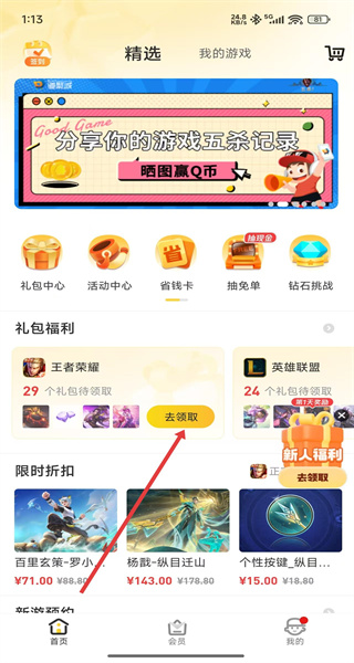 4、在主頁中,可以點(diǎn)擊去領(lǐng)取按鈕,進(jìn)行領(lǐng)取相關(guān)道具。