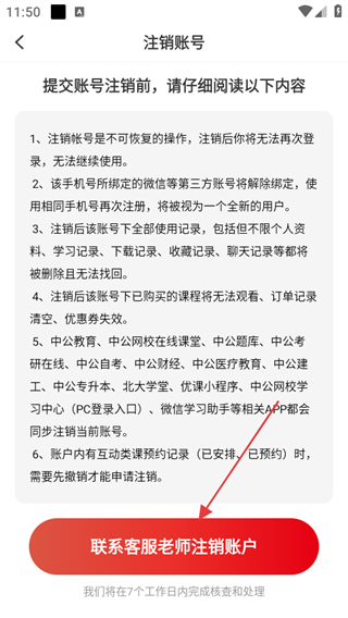 4、在注銷賬號(hào)頁面,點(diǎn)擊聯(lián)系客服老師注銷賬戶。