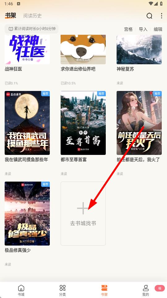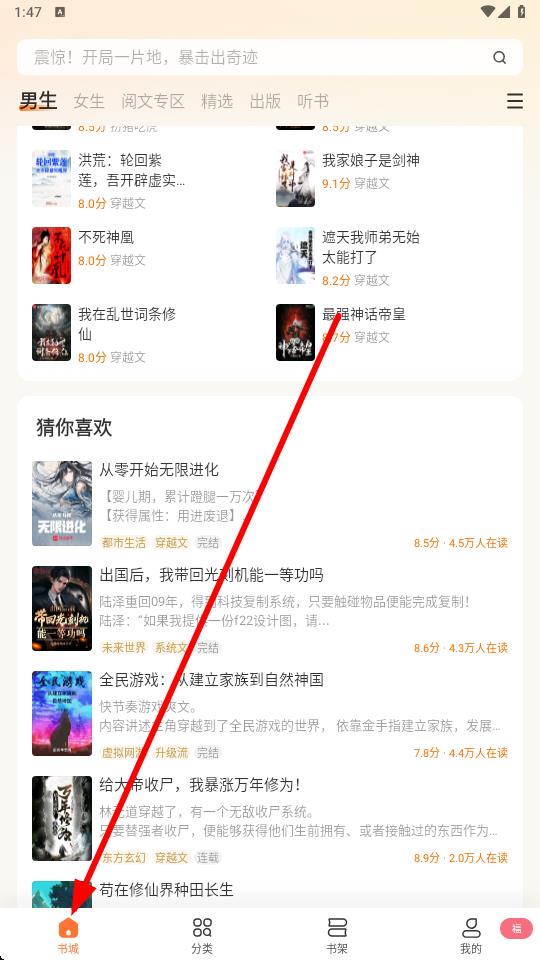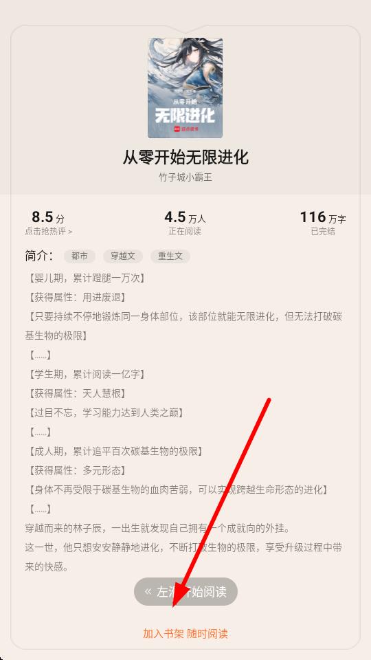 2、在書城界面瀏覽書籍,找到想加入書架的書籍,比如從零開始無限進(jìn)化。