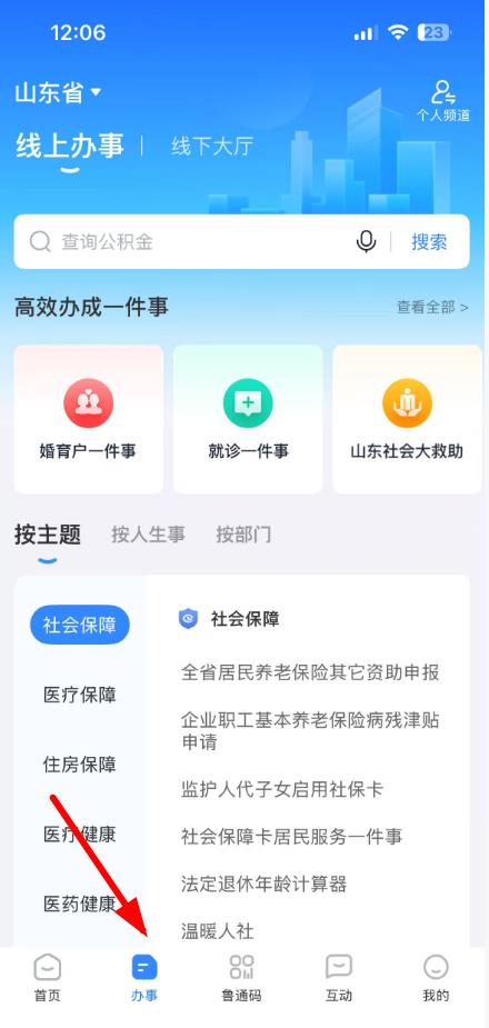 2、愛山東APP的辦事頁面,頂部有線上辦事和線下大廳,分類與搜索欄,呈現婚育戶、就診等集成服務,按社會保障分類下列出多項社保業(yè)務。