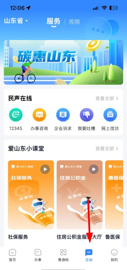 3、點擊底部導航欄的互動選項,在民聲在線區(qū)域即可看到12345、辦事咨詢、企業(yè)訴求、我要吐槽、網上信訪等功能入口。