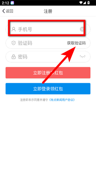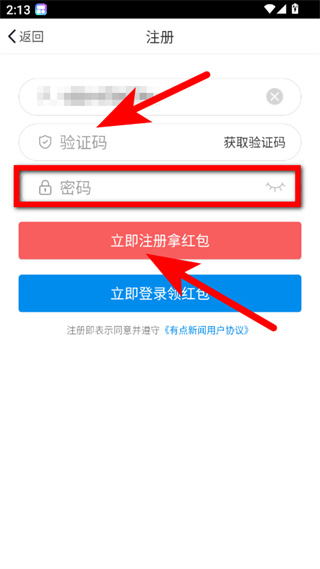 4、輸入收到的驗證碼,設置登錄密碼,點擊立即注冊拿紅包按鈕即可。