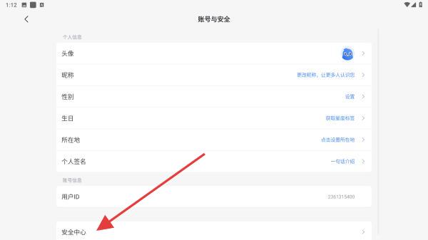 3、在賬號(hào)與安全的界面內(nèi),向下滑動(dòng)找到并點(diǎn)擊安全中心。