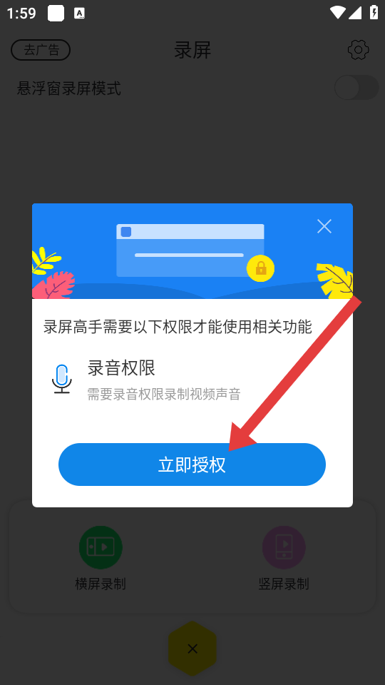 3、在錄屏高手需要以下權(quán)限才能使用相關(guān)功能的彈窗中,點(diǎn)擊立即授權(quán)按鈕。