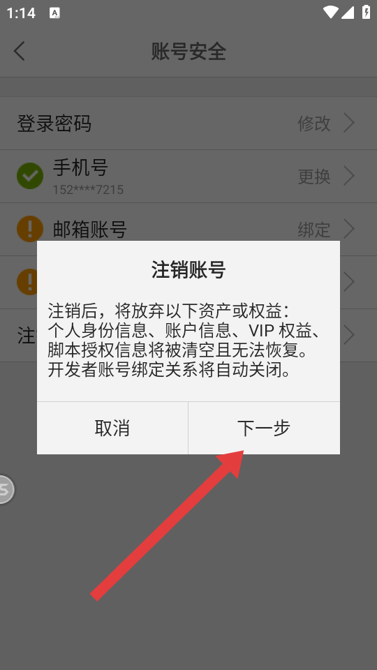 3、在注銷賬號提示框中,點擊下一步按鈕,進(jìn)入密碼驗證環(huán)節(jié)。