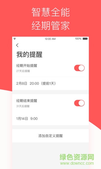 【貼心提醒】您可以根據(jù)自己的需求設(shè)置經(jīng)期開始前和經(jīng)期結(jié)束時的提醒及其他自定義提醒
