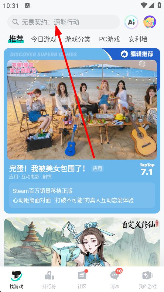 1、打開Taptap應(yīng)用,在首頁(yè)頂部找到搜索欄,點(diǎn)擊搜索欄。