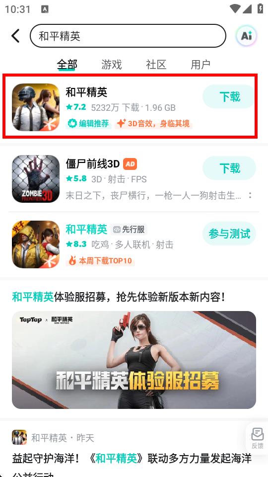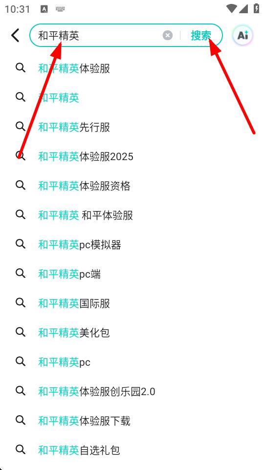 2、在搜索欄中輸入想要查找的游戲名稱,例如和平精英,輸入完成后,點(diǎn)擊搜索欄右側(cè)的搜索按鈕。