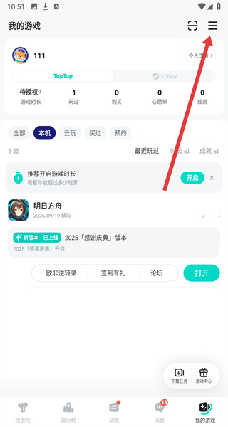 1、在“我的游戲”頁(yè)面點(diǎn)擊右上角三條橫線圖標(biāo),展開側(cè)邊欄。