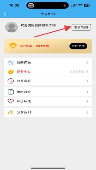 2、進(jìn)入個人中心頁面,點擊登錄/注冊的按鈕。