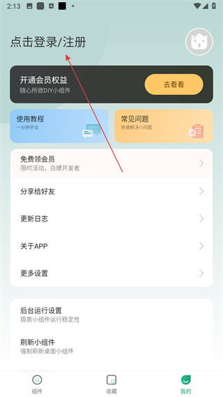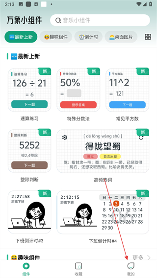 1、打開萬象小組件應(yīng)用,進(jìn)入組件頁面,找到底部導(dǎo)航欄的我的選項(xiàng),點(diǎn)擊進(jìn)入個(gè)人界面。