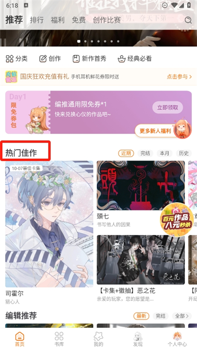 1、進(jìn)入軟件后可以看到在首頁(yè)就有很多的作品,比如熱門佳作是如今比較火的一些作品排行;