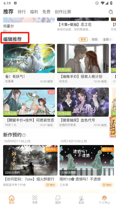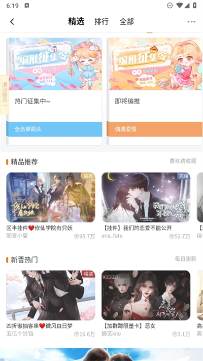 2、接著還能看到編輯推薦的一些作品,并根據(jù)文章的最新、完結(jié)和全部進(jìn)行分類排序;