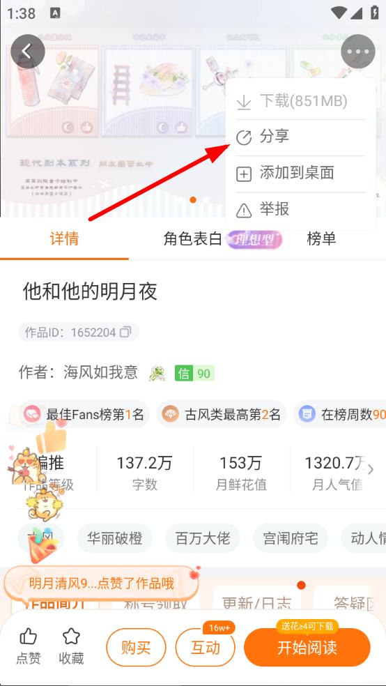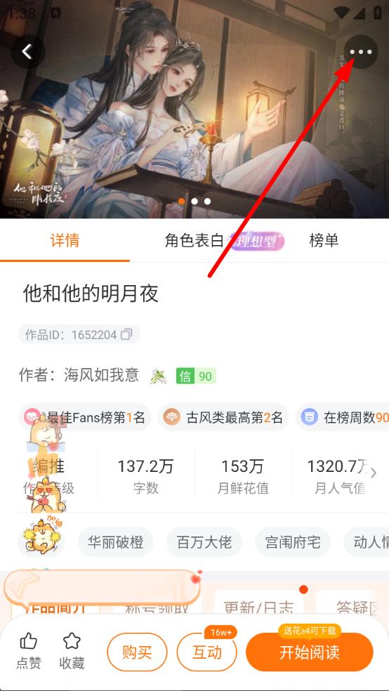 1、打開(kāi)橙光某一作品如他和他的明月夜的詳情頁(yè)面,點(diǎn)擊右上角三個(gè)點(diǎn)圖標(biāo)。