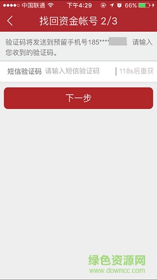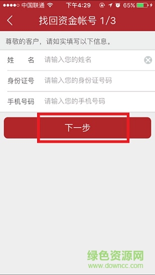 2.進(jìn)入找回資金界面,輸入需要找回帳戶的對應(yīng)姓名、身份證號、手機號碼,點擊【下一步】按鈕